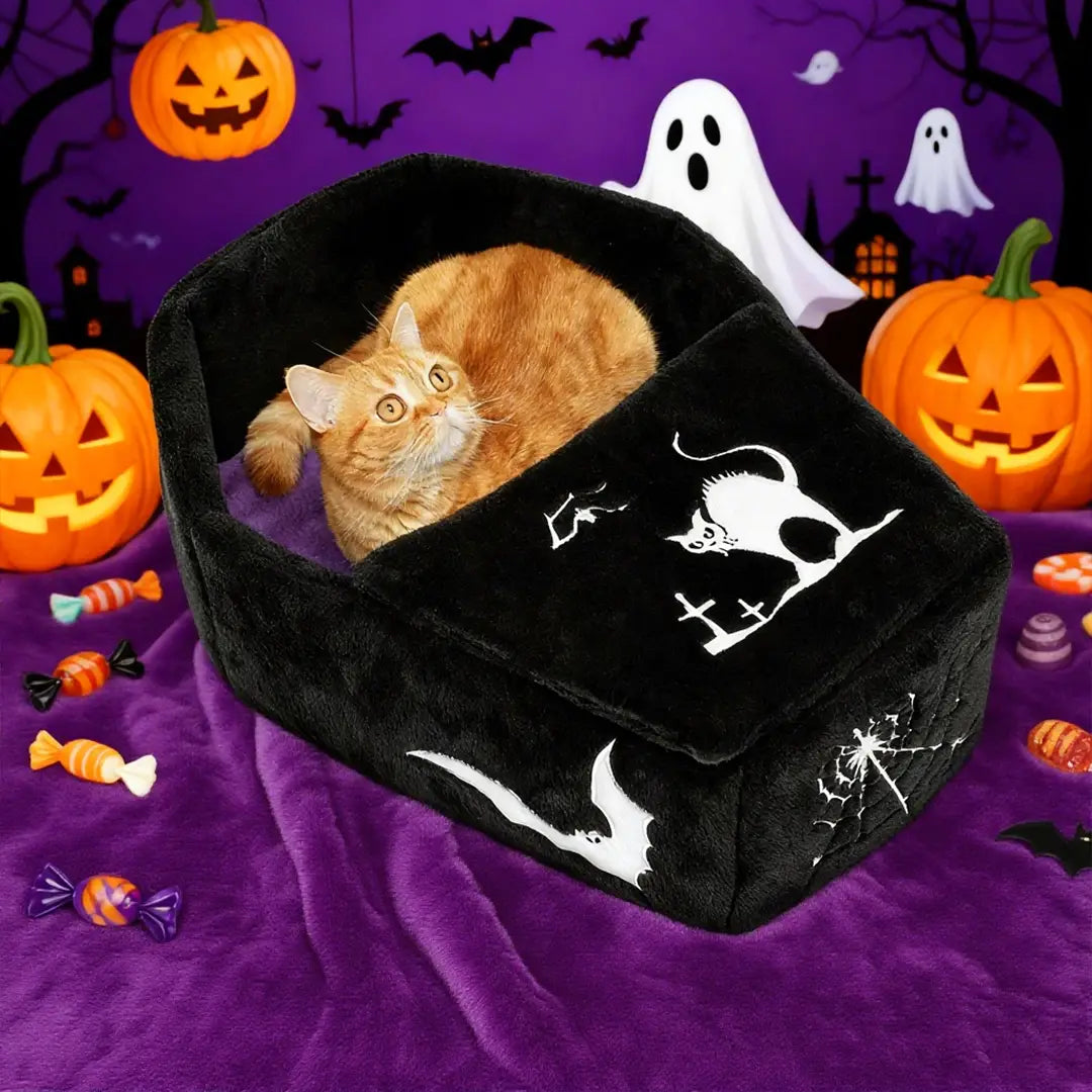Dark elegance meets cozy retreat. This half-enclosed, openable coffin-shaped pet bed is designed to bring a touch of gothic charm and festive Halloween spirit into your home—while offering your furry friend the ultimate in comfort.