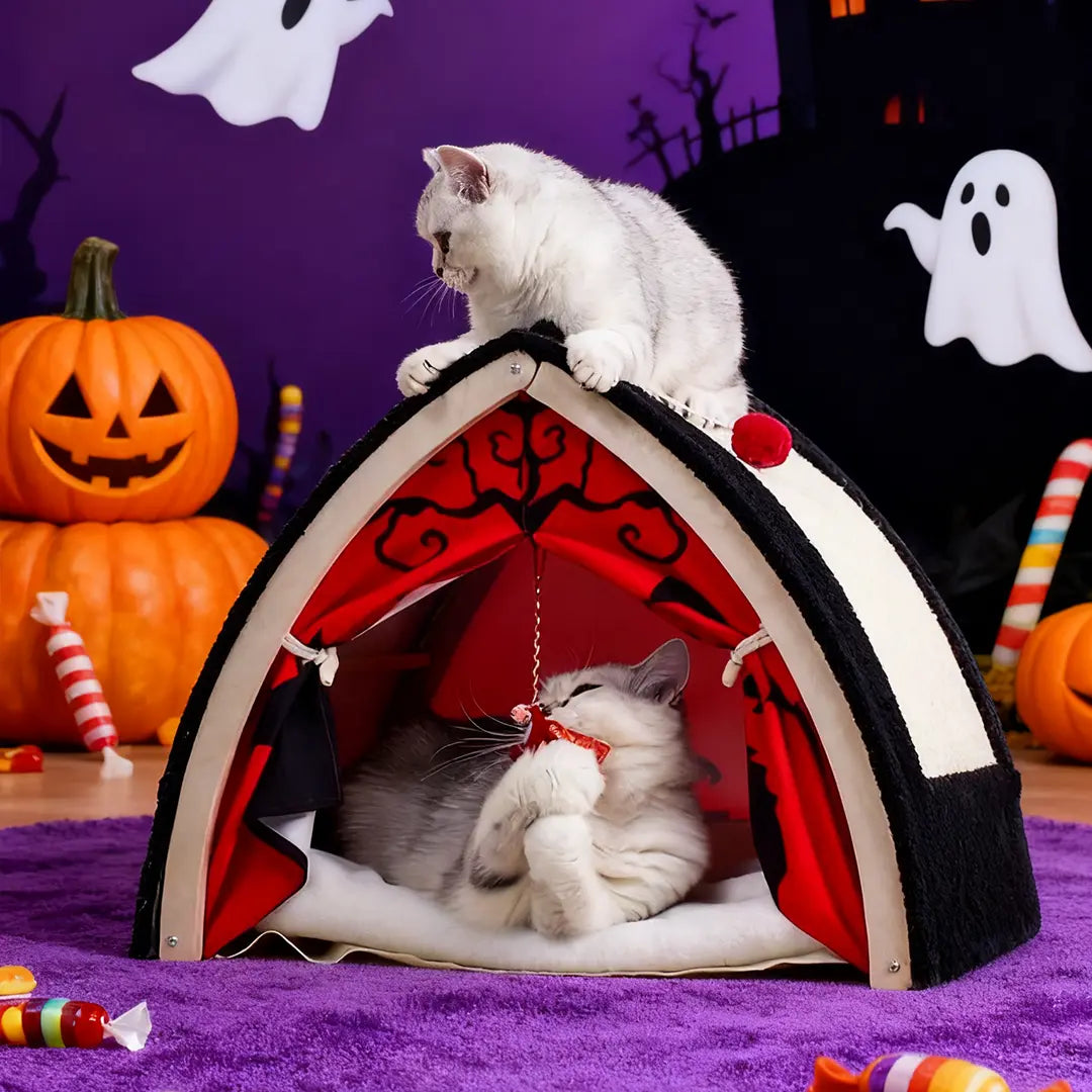 The Halloween Bat Cat Tent Bed combines a cozy foldable tent with a sisal scratching top, giving your feline both a private hideaway and a fun outlet for claw care.