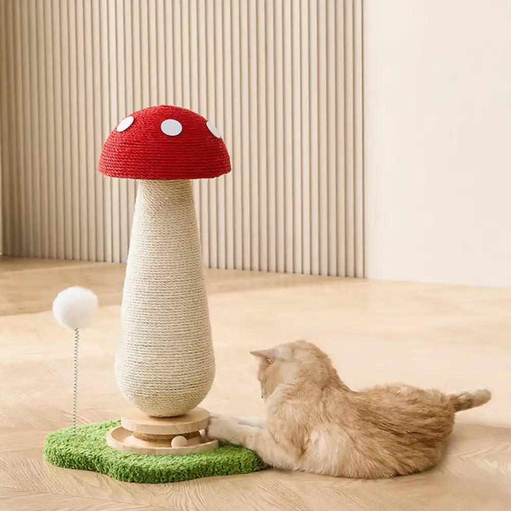 The Spin & Scratch Cat Post combines nature-inspired design with interactive fun. Choose from two whimsical shapes — a forest mushroom or a tropical palm tree — each topped with textured sisal wrapping for satisfying claw action.